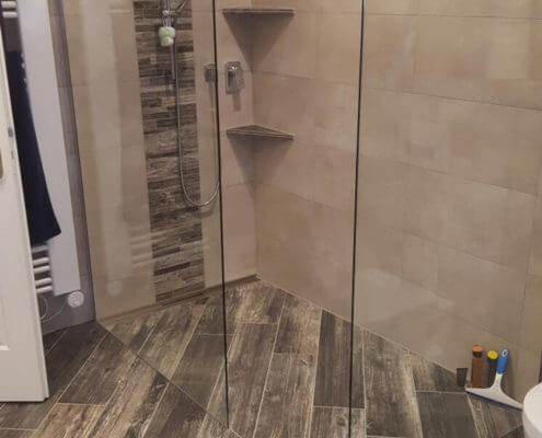 Die dargestellte Kombination aus Glas, Keramik und Holzoptik der Fliesen ist nicht nur etwas fürs Auge, sondern das Alltagsleben in so einem Bad sorgt durch seine Gemütlichkeit für Entspannung.
